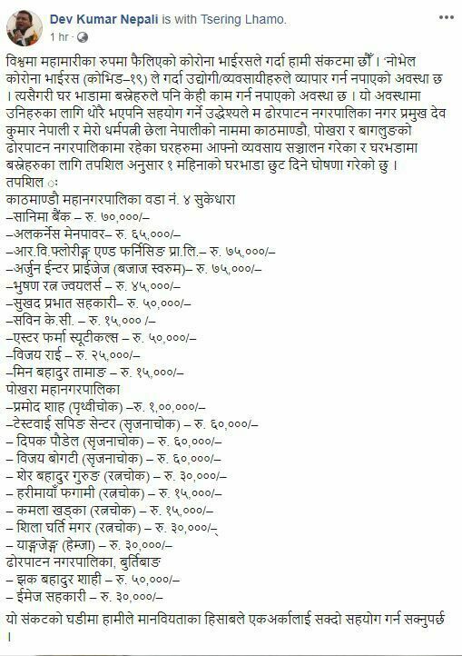 उनले आफ्नो फेसबुकवालमा स्ट्याटस मार्फत कोरोना भाइरसको प्रभावले कसैले पनि काम गर्न नपाएको र उद्योगी व्यापारीले पनि व्यापार गर्न नपाएको अवस्थामा आफूले आफ्ना घरहरुमा भाडामा बस्ने, भाडामा लिएर व्यापार व्यवसाय गर्ने सबैलाई एक महिनाको भाडा छुट गरिदिएको बताएका छन् ।