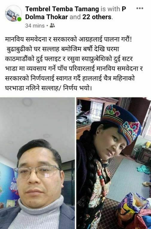 सरकारले कोरोना भाइरसबाट सिर्जिन परिस्थितिका कारण घरधनीहरुलाई एक महिनाको घरभाडा नलिन अनुरोध गरेकोसँगै तामाङले पनि चैत महिनाको एक महिनाको घरभाडा नलिने निर्णय लिएका हुन् ।