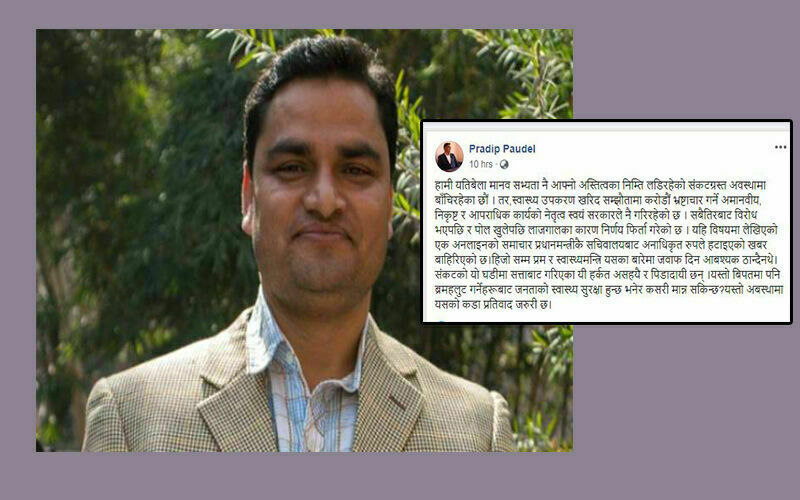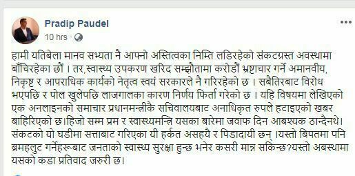 सामाजिक सञ्जाल फेसबुकमा स्टाटस पोष्ट गर्दै नेता पौडेलले कोरोना भाइरस ‘कोभिड १९’ का लागि आवश्यक स्वास्थ्य उपकरण खरिद सम्झौतामा करोडौं भ्रष्टाचार गर्ने अमानवीय, निकृष्ट र आपराधिक कार्यको नेतृत्व स्वयं सरकारले नै गरिरहेको भन्दै सबैतिरबाट विरोध भएपछि र पोल खुलेपछि लाजगालका कारण निर्णय फिर्ता गरेको र यहि विषयमा लेखिएको एक अनलाइनको समाचार प्रधानमन्त्रीकै सचिवालयबाट अनाधिकृत रुपले हटाइएको खबर बाहिरिएको प्रति प्रतिक्रिया जनाउँदै लेखेका छन्, ”हामी यतिबेला मानव सभ्यता नै आफ्नो अस्तित्वका निम्ति लडिरहेको संकटग्रस्त अवस्थामा बाँचिरहेका छौं । तर,स्वास्थ्य उपकरण खरिद सम्झौतामा करोडौं भ्रष्टाचार गर्ने अमानवीय, निकृष्ट र आपराधिक कार्यको नेतृत्व स्वयं सरकारले नै गरिरहेको छ । सबैतिरबाट विरोध भएपछि र पोल खुलेपछि लाजगालका कारण निर्णय फिर्ता गरेको छ । यहि विषयमा लेखिएको एक अनलाइनको समाचार प्रधानमन्त्रीकै सचिवालयबाट अनाधिकृत रुपले हटाइएको खबर बाहिरिएको छ।हिजो सम्म प्रम र स्वास्थ्यमन्त्रि यसका बारेमा जवाफ दिन आबश्यक ठान्दैनथे।संकटको यो घडीमा सत्ताबाट गरिएका यी हर्कत असहयै र पिडादायी छन् । यस्तो बिपतमा पनि ब्रमहलुट गर्नेहरूबाट जनताको स्वास्थ्य सुरक्षा हुन्छ भनेर कसरी मान्न सकिन्छरुयस्तो अबस्थामा यसको कडा प्रतिवाद जरुरी छ।”