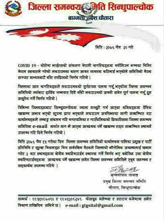 सारा विश्वभर नै महामारीको प्रकोपले सताएको बेला जिल्ला समन्वय समिति सिन्धुपाल्चोकले जिल्लामा अन्य जिल्लाहरुबाट ज्याला मजदुरीको सिसलसिलामा आएका मजदुरहरुको दैनिक खाद्यान्न आवश्यक परे उपलब्ध गराउने निर्णय गरेको छ ।