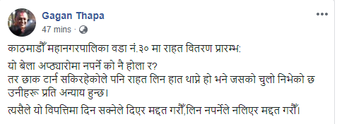 राहत वितरणको तस्वीर सामाजिक सञ्जाल फेसवुकमा राख्दै थापाले भनेका छन्, “विपत्तिमा दिन सक्नेले दिएर मद्दत गरौँ,लिन नपर्नेले नलिएर मद्दत गरौँ।”