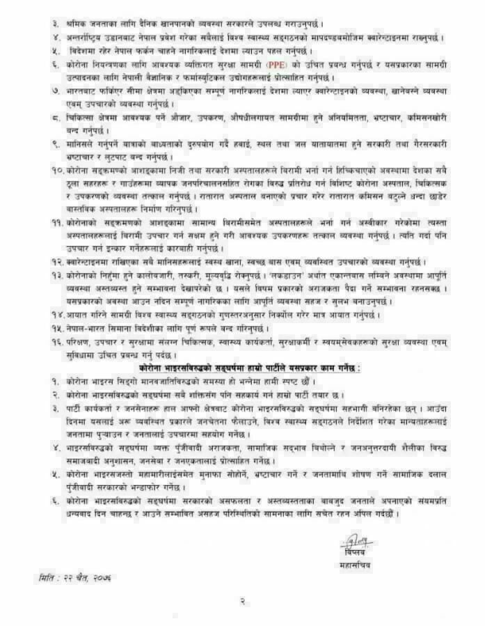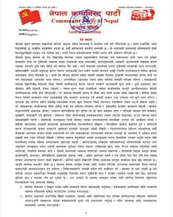 ‘कोरोना आशंकामा निजी क्षेत्रबाट चलेका अस्पतालहरुले बिरामीको उपचार गर्न अस्वीकार गरेको र केहीको ज्यान समेत गएकाले सरकारको सूचनाप्रणालीमा विश्वसनीयता देखिएन’, विप्लवको विज्ञप्तिमा भनिएको छ, ‘बिरामीहरु कोरोना प्रभावित हुने र कोरोनाकै कारण मरेकाहरुको सूचना सरकारले लुकाएको हुनसक्ने आशंका बढेको देखियो ।’