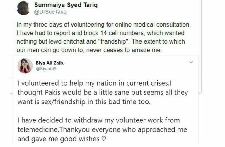 पाकिस्तानमा एप्स अनलाईनको माध्यमबाट कोरोना भाइरसबाट संक्रमितहरुको सहयोगको लागि डाक्टरहरुलाई जिम्मा दिइएको छ । त्यसमा महिला डाक्टरहरु नै सामेल रहेका छन् । तर केहि मानिसहरुले भने उक्त प्लेटफर्ममा महिला डाक्टरहरुको साथमा अश्लिलताको सीमा पार गरिरहेका छन् ।