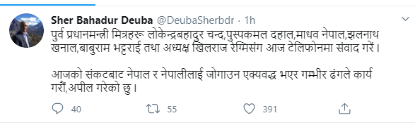 आइतवार एक ट्वीट गरि सभापति देउवाले नेपाल र नेपाली जनतालाई ऐक्यवद्ध ढंगले अघि बढ्ने अपिल गरेको बताएका छन् ।