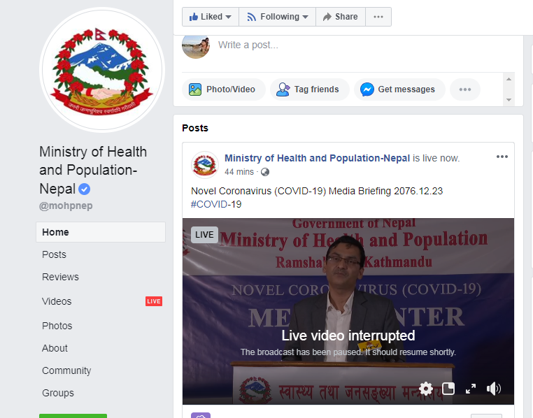 यसैबीच नियमित पत्रकार सम्मेलन लाईभ गरिरहेको स्वास्थ्य तथा जनसंख्या मन्त्रालयको अफिसियल साईटमा प्रवक्ता बोल्दा निकैपटक अड्किएर पूरा विवरण नसकिँदै भिडियो काटिएको थियो ।