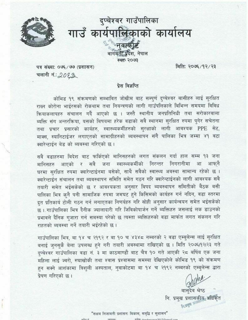 गाउँपलिकाले एक विज्ञप्ती जारी गर्दै त्यस्तो जानकारी दिएको हो । गाउँपालिकको अनुसार ती महिलालाई ज्वरो,रुघाखोकी तथा स्वास प्रस्वासमा समस्या देखिएपछि अस्पताल पठाइएको जनाइएको छ ।