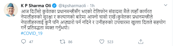 प्रधानमन्त्री ओलीले कुवेतका प्रधानमन्त्रीसँग फोनवार्ता भएको ट्वीट मार्फत जानकारी दिएका हुन् ।