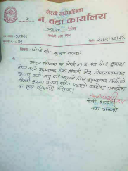 गाउँपालिकाको एम्बुलेन्सको दुरुपयोगमा जनप्रतिनिधिको पनि संग्लनता रहेको पाइएको छ । भैरवी गाउँपालिका वडा नं ३ का वडाअध्यक्ष देवि भण्डारीको सिफारिसमा उक्त एम्बुलेन्स मंगलबार नेपालगन्ज जान लागेको खुलेको हो । सिफारिसमा बिरामि लिएर जाने भनिएपनि एम्बुलेन्समा कोहि पनि बिरामी नभएकोले नियन्त्रणमा लिइएको प्रहरीले जनाएको छ ।