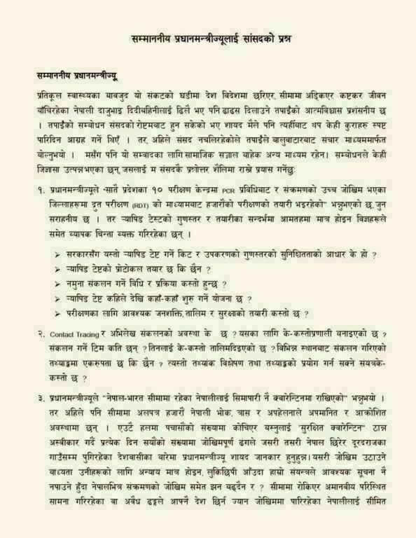 प्रतिकूल स्वास्थ्यका बाबजुद यो संकटको घडीमा देश विदेशमा छरिएर, सीमामा अड्किएर कष्टकर जीवन बाँचिरहेका नेपाली दाजुभाइ दिदी-बहिनीलाई ढिलै भए पनि ढाढस दिलाउने तपाईँको आत्मविश्वास प्रशंसनीय छ । तपाईँको सम्बोधन संसदको रोष्टमबाट हुन सकेको भए शायद मैले पनि त्यहीँबाट थप केही कुराहरु स्पष्ट पारिदिन आग्रह गर्ने थिएँ । तर, अहिले संसद नचलिरहेकाले तपाईँले बालुवाटारबाट संचार माध्यममार्फत बोल्नुभयो । मसँग पनि यो सम्वादका लागि सामाजिक सञ्जाल बाहेक अन्य माध्यम रहेन। सम्बोधनले केही जिज्ञासा उत्पन्न भएका छन्, जसलाई म संसदकै प्रश्नोत्तर शैलीमा राख्ने प्रयास गर्नेछु: