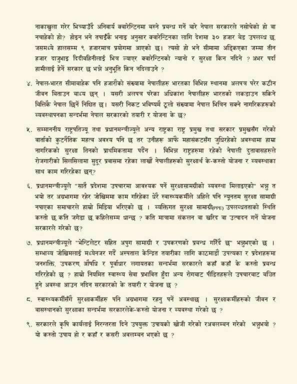 ३. प्रधानमन्त्रीज्यूले “नेपाल-भारत सीमामा रहेका नेपालीलाई सिमापारी नै क्वारेन्टिनमा राखिएको” भन्नुभयो । तर अहिले पनि सीमामा अलपत्र हजारौं नेपाली भोक, त्रास र अपहेलनाले अपमानित र आक्रोशित अवस्थामा छन् । एउटै हलमा पचासौंको संख्यामा कोचिएर बस्नुलाई ‘सुरक्षित क्वारेन्टिन” ठान्न अस्वीकार गर्दै प्रत्येक दिन सयौंको संख्यामा जोखिमपूर्ण ढंगले जसरी तसरी नेपाल छिरेर दूरदराजका गाउँसम्म पुगिरहेका देशवासीका बारेमा प्रधानमन्त्रीज्यू शायद जानकार हुनुहुन्न । यसरी जोखिम उठाउने बाध्यता उनीहरूको लागि अन्याय मात्र होइन, लुकिछिपी आँउदा हाम्रो संयन्त्रले आवश्यक सूचना नै नपाउने हुँदा नेपालभित्र संक्रमणको जोखिम समेत झन बढ्दैन र ? सीमामा रोकिएर अमानवीय परिस्थित सामना गरिरहेका वा अवैध ढङ्गले आफ्नै देश छिर्न ज्यान जोखिममा पारिरहेका नेपालीलाई सीमित नाकाखुला गरेर भित्र्याउँदै अनिवार्य क्वारेन्टिनमा बस्ने प्रबन्ध गर्ने बारे नेपाल सरकारले नसोचेको हो वा नचाहेको हो ? होइन भने तपाईँकै भनाइ अनुसार क्वारेन्टिनका लागि देशमा ३० हजार बेड उपलब्ध छ, जसमध्ये हालसम्म ९ हजारमात्र प्रयोगमा आएको छ। त्यसो हो भने सीमामा अड्किएका जम्मा तीन हजार दाजुभाइ दिदीबहिनीलाई भित्र ल्याएर क्वारेन्टिनको न्यानो र सुरक्षा किन नदिने ? अभर पर्दा हामीलाई हेर्ने सरकार छ भन्ने अनुभूति किन नदिलाउने ?