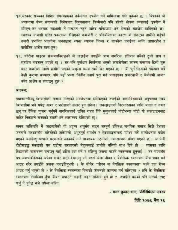 मानव जातिमाथि नै जाइलागेको यो अदृष्य शत्रुसँग लड्न सम्पूर्ण प्रतिपक्ष, नागरिक समाज, सिङ्गो देशका जनताले सरकारसँग गरिरहेको हातेमालो, अभूतपूर्व समर्थन र ऐक्यबद्धतालाई उपेक्षा गर्दै सम्बोधनमा प्रयोग भएको असहिष्णु भाषाले सरकारले सहकार्य गर्न आवश्यक नठानेको नकारात्मक संदेश गएको छ । म फेरि दोहोर्याउँछु, संकटको यस घडीमा सरकारको नेतृत्वलाई हामीले बलियो साथ दिने हो । त्यसका लागि विश्वासको वातावरण बनाउनु पर्छ, अप्रिय प्रश्न गर्ने र सहिष्णु जवाफ पाउने स्वतन्त्रता हुनुपर्छ । तर राज्यसँग थप जवाफदेहिताको अपेक्षा राखेर बाटो देखाउनु पर्ने यस्तो बेला जीवन र वैयक्तिक स्वतन्त्रता बीच चयन गर्ने आग्रह गरेर तपाईँले अवाक् बनाइदिनुभयो । के सोचेर “जीवन वा वैयक्तिक स्वतन्त्रता” मध्ये एक रोज्न आग्रह गर्नु भएको हो ? के वैयक्तिक स्वतन्त्रता बिनाको जीवनको कल्पना गर्न सकिएला ? अनि के वैयक्तिक स्वतन्त्रता निलम्बित हुँदा जीवन बचाउने लडाइँ लड्न सजिलो हुने हो ? तपाईंले यसको पनि सन्दर्भ स्पष्ट पार्नु नै हुनेछ भन्ने अपेक्षा सहित,