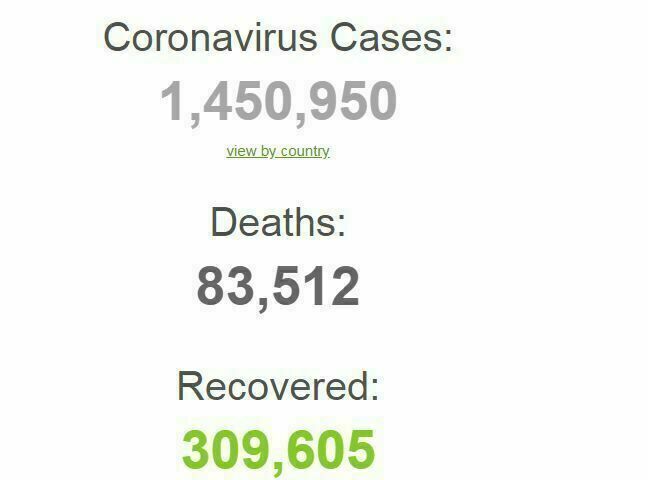 काठमाडौं । कोरोना भाइरस संक्रमितको संख्या विश्वभर साढे १४ लाख नाघेको छ । बुधबार साँझसम्म १४ लाख ५० हजार नाघेको हो । यस्तै ८३ हजार ५१२ जनाको मृत्यु भएको छ ।