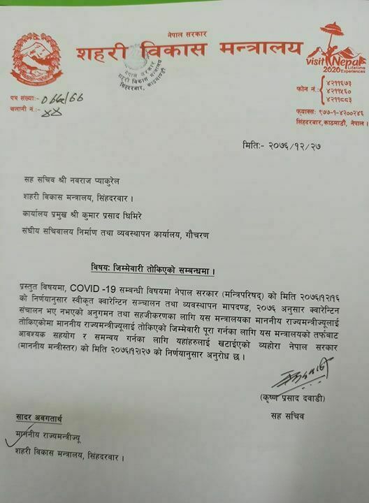 सहरी विकास मन्त्रालयका तर्फबाट पनि आज मन्त्रीस्तरिय निर्णय गर्दै सहसचिव नवराज प्याकुरेल र संघीय सचिवालय निर्माण तथा व्यवस्थापन कार्यालयका प्रमुख सहसचिव कुमार प्रसाद घिमिरेलाई खटाइएको छ । गत चैत्र १६ गतेको मन्त्रिपरिषद्को बैठको निर्णय कार्यान्वयनका लागि मन्त्रालयले आवश्यक सहयोग र समन्वयका लागि राज्यमन्त्रीकसँगको टोलीमा दुई सहसचिवलाई पठाएको हो ।