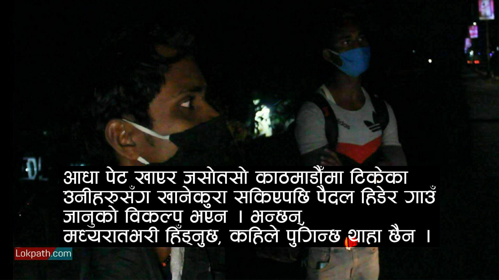 काठमाडौं कोटेश्वरको सडकका पोलमा बलेका बत्तिको उज्यालोमा पाईला अघि बढाउँदै थिए,उनीहरु । ७ जनाको समूहमा हिँडेका उनीहरु लकडाउनकै बीचमा काठमाडौंबाट करिब ३ सय ५८ किलोमिटरको बाटो पैदल हिँडेरै तय गर्दैथिए । कोरोनाबाट बच्न अनिवार्य मास्क प्रयोग गरौँ भनेको सन्देश सुनेका उनीहरुको मुखमा पातलो कपडाको मास्क देखिन्थ्यो । झोलामा बोकेको चिउरा र दालमोठ बाटो खाजा । “रातभरी हिड्नुछ, यहि दालमोठ चिउरा फाँको मार्दै कस्सिएर नहिँडे ७ दिनभन्दा बढी लाग्छ । ” उनीहरुको मधुरो आवाज सुनियो ।