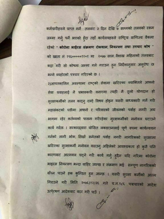 पत्रमा प्रहरी महानिरीक्षक (आईजीपी) र प्रहरी अतिरिक्त महानिरीक्षक (एआईजी), प्रहरी नायब महानिरीक्षक (डीआईजी) र प्रहरी बरिष्ठ उपरीक्षक (एसएसपी) ले सात दिनको तलब कट्टा गरी कोषमा जम्मा गर्नुपर्ने जनाइएको छ ।