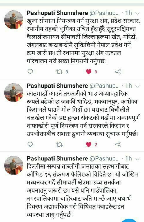 ‘खुला सीमाना नियन्त्रण गर्न सुरक्षा अंग, प्रदेश सरकार, स्थानीय तहको भूमिका उचित हुँदाहुँदै सुदूरपश्चिमका कैलालीलगायत सीमावर्ती जिल्लाहरूमा खेतबारी, गोरेटो, जंगलबाट बन्दाबन्दीमै लुकिछिपी नेपाल प्रवेश गर्ने क्रम जारी छ । सुरक्षा अंग तत्काल परिचालन गरी ती स्थानमा सख्त निगरानी गर्नुपर्छ,’ मंगलबार एक सन्देश जारी गर्दै अध्यक्ष राणाले भने ।