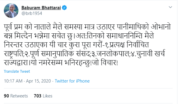 प्रत्यक्ष निर्वाचित राष्ट्रपति, पूर्ण समानुपातिक संसद, जनलोकपाल, चुनावी खर्च राज्यद्वारा लगायतका मागहरु रहेका बताएका छन् । बुधवार एक ट्वीट गर्दै डाक्टर भट्टराईले भनेका छन्, “पूर्व प्रमको नाताले मैले समस्या मात्र उठाएर पानीमाथिको ओभानो बन्न मिल्दैन भन्नेमा सचेत छु।”