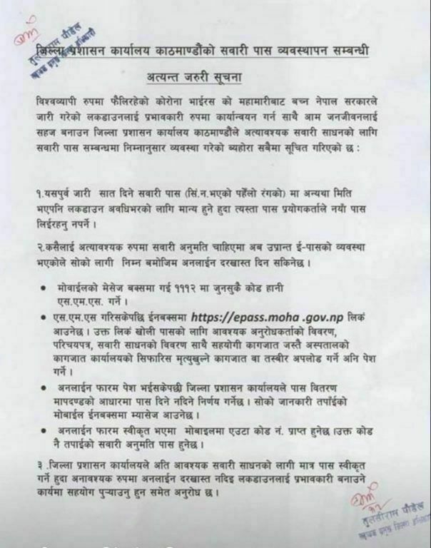 कार्यालयका अनुसार परिवारका सदस्यको मृत्यु संस्कारमा जाने व्यक्तिहरुलाई बोहक अन्य प्रयोजनका लागि सवारी पास जारी नहुने स्पष्ट पारेको छ ।