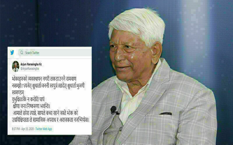 काठमाडौं – पूर्वमन्त्री तथा नेपाली कांग्रेसका नेता अर्जुननरसिंह केसीले लकडाउनको बाध्यताले सिर्जना गरेका समस्या समाधानका लागि सरकारको ध्यानाकर्षण गरेका छन् । सामाजिक सञ्जाल फेसबुक र ट्वीटरमा ट्वीट गर्दै उनले लक डाउनको बाध्यताले निम्त्याएको असर र यसबाट सिर्जित भएका समस्या समाधानतर्फ गम्भिर हुन सरकारलाई सुझाएका हुन् ।