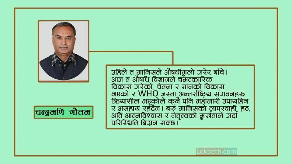 आज त औषधी विज्ञानले चमत्कारिक विकास गरेको, चेतना र ज्ञानको विकास भएको र विश्वस्वास्थ्य संगठन ९ध्ज्इ० जस्ता अन्तर्राष्ट्रिय संगठनहरू क्रियाशील भएकोले कुनै पनि महामारी उपायहिन र असहाय रहँदैन । खाली मानिसको लापरवाही, हठ, अतिआत्मविश्वास र नेतृत्वको मूर्खताले गर्दा परिस्थिति बिग्रन्छ । हालको कोरोना भाईरमा पनि यही विशेषता देखा पर्दैछ । नेतृत्वले लापरवाही गर्दा अमेरिकाजस्तो महाशक्तिमा, जनसमुदायले हठ र हेल्चेक्राईँ गर्दा ईटलीमा यसको बढ्ता मार परिरहेको छ भने भारतमा पनि कतिपय जनसमुदायको मूर्खता र जबरजस्तीको कारणले पनि यति पनि बढ्नु नहुने कोरोना भाईरस महामारी दिनानुदिन बढिरहेको छ ।