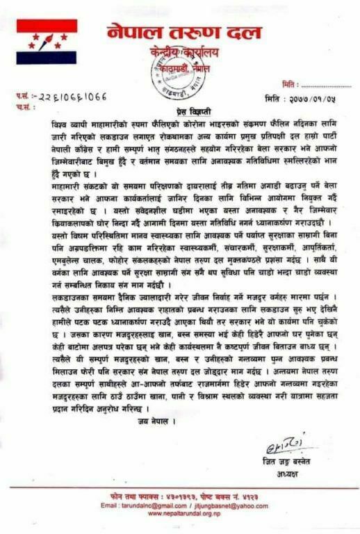 यसैक्रममा शुक्रवार एक विज्ञप्ती जारी गर्दै दरुण दलका अध्यक्ष जितजंग बस्नेतले घरतर्फ पैदल जाँदै गरेका मजदुरलाई खाने–बस्ने प्रबन्ध मिलाउन तरुण दलका नेता–कार्यकर्ताहरूसँग समेत आग्रह गरेका छन् ।
