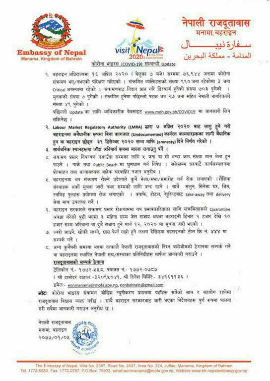 काठमाडौं । बहराइनमा थप २७ नेपालीमा कोरोना भाइरसको संक्रमण पुष्टि भएको छ । बहराईनस्थित नेपाली राजदूतावासले थप २७ जनामा कोरोना संक्रमण देखिएको जनाएको छ ।