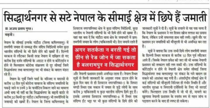 नेपाल भारतको सीमा क्षेत्रको कपिलवस्तु भित्र जमाती लुकेर बसेको भारतीय चर्चित पत्रिका राष्ट्रिय साहाराले दावी गरेको हो । दिल्ली मकरजवाट आएका तबलिगी जमाती चन्द्रौटा क्षेत्रमा लुकेर बसेको पत्रिकाको दाबी छ । मुस्लिम धर्म प्रचारक संस्थाका रुपमा चिनिएको यसले भारतको निजामुद्धिनमा आयोजना गरेको सम्मेलनवाटै भारतमा कोरोना भाइरसको संक्रमण फैलिएको भारतीय मिडियाको दावी रहँदै आएको छ । जावाभारी क्षेत्रमा पाकिस्तानबाट आएका मानिसहरु समेत लुकेर वसेको साहाराले समाचार छापेको छ । राष्ट्रिय साहाराका लागि वढनीवाट रिपोर्टिङ काम गर्ने पत्रकार अजयप्रताप गुप्ताले यो समाचार लेखेका हुन । वढनी कृष्णनगरंसँग जोडिएको क्षेत्र पर्छ ।