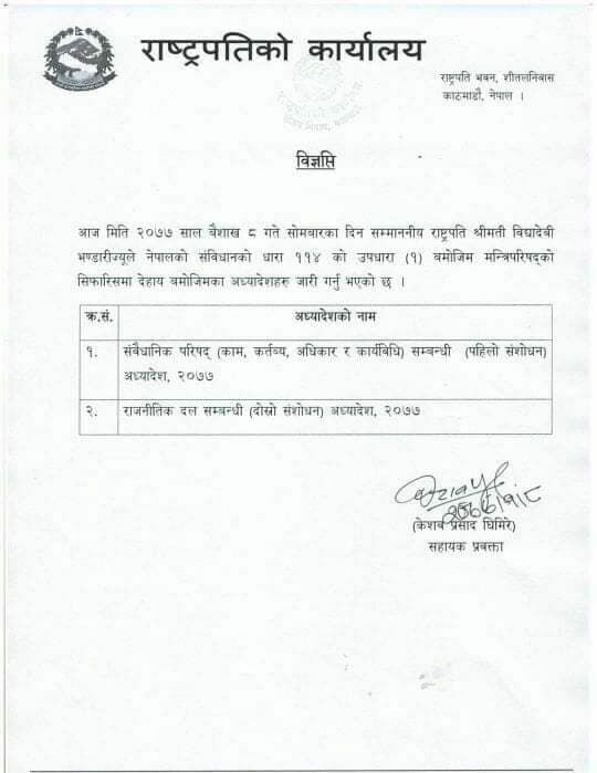 राष्ट्रपतिले राजनीतिक दलसम्बन्धी (दोस्रो संशोधन) अध्यादेश र संवैधानिक परिषद् (काम, कर्तव्य, अधिकार र कार्यविधि) सम्बन्धी (पहिलो संशोधन) अध्यादेश, २०७७ लाई प्रमाणीकरण गरेकी हुन् ।