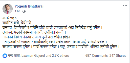 कार्यकर्तामा सान्त्वना दिँदै सरकार, पार्टी सफल हुने साथै राष्ट्रको भविष्य सुनौलो हुने कुरामा जोड दिएका छन् । सामाजिक सञ्जाल फेसबुकमा लेखेका छन्, “नेताहरुको परिपक्वता र कार्यकर्ताहरुको सचेतनताले नेकपा अझै बलियो बन्नेछ । सरकार सफल हुनेछ । पार्टी सफल हुनेछ । राष्ट्र, जनता र पार्टीको भबिस्य सुनौलो हुनेछ ।”