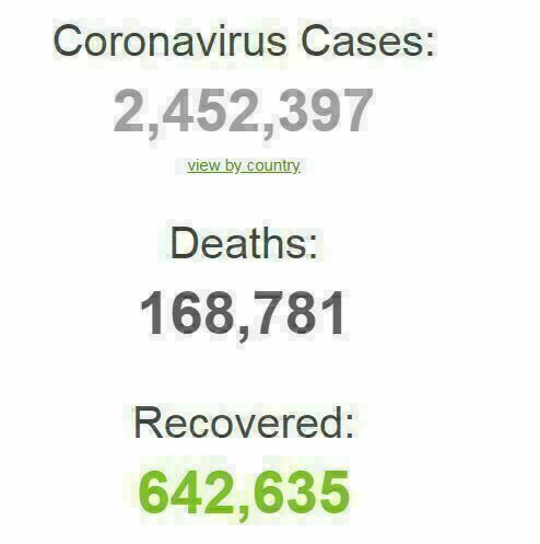 काठमाडौं । विश्वव्यापी महामारीको रुपमा फैलिएको कोरोना भाइरस कोभिड १९ कारण यो समाचार तयार पार्दासम्म १ लाख ६८ हजार ७८१ जनाको मृत्यु भएको छ, भने हालसम्म विश्वभर २४ लाख ५२ हजार ३ सय ९७ जना मानिसमा कोरोना संक्रमण भएको र ६ लाख ४२ हजार ६सय ३५ जना मानिस उपचारपछि निको भएर घर फर्किएको वल्डोमिटरको तथ्यांकले देखाएको छ । भने ५६ हजार १ सय ६४ जनाको अवस्था गम्भिर रहेको छ ।