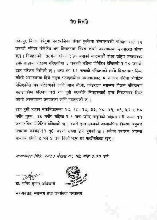 “उदयपुर जिल्ला त्रियुगा नगरपालिका स्थित भुल्केमा शंकास्पदको परिक्षण गर्दा १२ जनाको नतिजा पोजेटिभ भइ बिराटनगर स्थित कोशी अस्पतालमा उपचाररत रहेका छन् । निजहरूको संसर्गमा रहेका २६० जनाको काठमाडौँ स्थित राष्ट्रिय जनस्वास्थ्य प्रयोगशालामा परिक्षण गरिएकोमा ३ जनाको नतिजा पोजेटिभ देखिएको र २० जनाको हाल परिक्षण भैरहेको छ । अन्य थप ६९ जनाको परिक्षणको लागि बिराटनगर स्थित कोशी अस्पतालमा हिजै नमुना पठाइएकोमा अस्पतालबाट ८ जनाको नतिजा पोजेटिभ देखिएकोले थप परिक्षणको लागि आज वी.पी. कोइराला स्वास्थ्य विज्ञान प्रतिष्ठानमा पठाइएकोमा परिक्षण गर्दा थप पुष्टी भएकोले निजहरूलाई हाल बिराटनगर स्थित कोशी अस्पतालमा उपचारका लागि पठाइएको छ ।