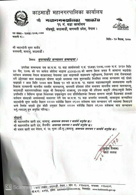 काठमाडौं । काठमाडौं महानगरपालिका वडा नं १६ स्थित वनस्थली, बालाजुमा रहेको भाटभटेनी सुपरमार्केट बिहान ४ बजेदेखी ९ बजेसम्म मात्र सञ्चालन हुने भएको छ । कोरोना भाइरस रोकथाम तथा नियन्त्रणको लागि सरकारले देशभर लकडाउन गरेको छ । अत्यावश्यक पसलहरु बाहेक बजार बन्द गरिने भनिए पनि कतिपय ठाँउमा भाटभटेनी सुपरमार्केटहरु सञ्चालनमा रहि आएका छन् ।