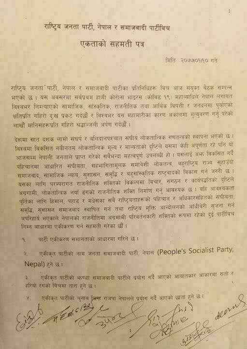 काठमाडौं । समाजवादी पार्टी र राजपा नेपाबीच एकता गर्ने सहमति भएको छ। दुई दलबीच बुधबार रातिसम्पन्न बैठकबाट एकता गर्ने समझदारी भएको हो ।