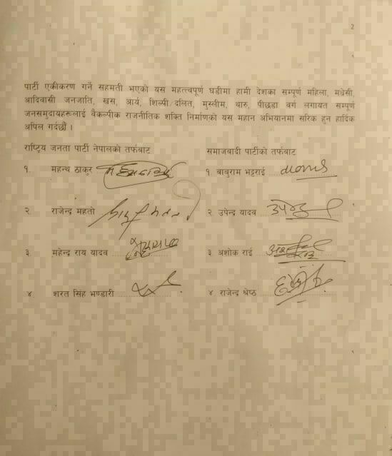समझदारी पत्रमा राजपाको तर्फबाट महन्थ ठाकुर, राजेन्द्र महतो, महेन्द्र राय यादव र शरतसिंह भण्डारीले हस्ताक्षर गरेका छन् । भने समाजवादीको तर्फबाट बाबुराम भट्टराई, उपेन्द्र यादव, अशोक राई र राजेन्द्र श्रेष्ठले गरेका छन् । राजपामा ६ जनाको अध्यक्षमण्डल र समाजवादीमा २ जना अध्यक्षको व्यवस्था छ । समझदारीमा नेतृत्वबारे केही नखुलाइएपनि ८ जना अध्यक्षको अध्यक्षमण्डल रहनेगरी छलफल भएको बताइएको छ ।