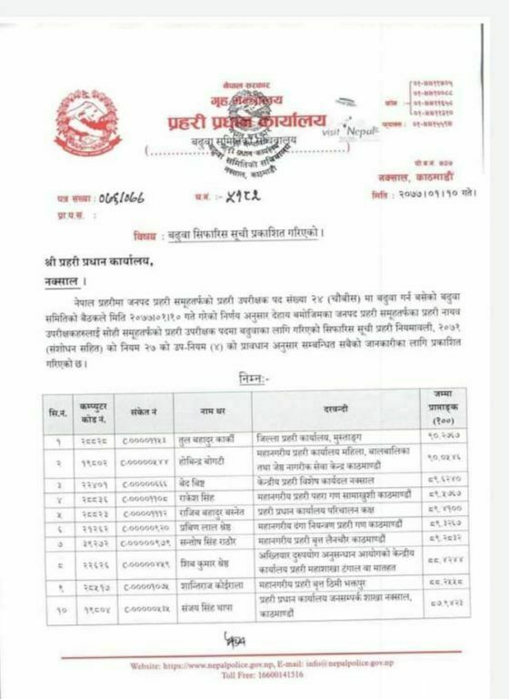 नेपाल प्रहरीका २४ डिएसपी एसपी बढुवा सिफारिस (नामावलीसहित)