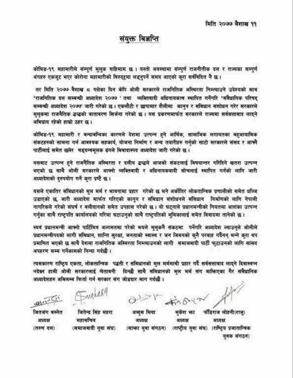 साथै राष्ट्रिय एकता, लोकतान्त्रिक पद्धति र संविधानको मर्ममाथि प्रहार गर्दै सर्वसत्तावाद लाद्ने दिवास्वप्न नदेख्न प्रधानमन्त्री ओलीलाई चेतावनी समेत दिएका छन्। साथै संविधानको मुल मर्मसँग बाझिएका गैर संवैधानिक अध्यादेशहरु अभिलम्ब फिर्ता गर्नुपर्ने उनीहरुको माग रहेको छ ।