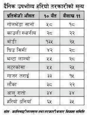 लकडाउनले काठमाडौं उपत्यकामा दैनिक उपभोग्य हरियो तरकारीको मूल्य तीन गुणा बढीले घटेको खबर आजको राजधानी दैनिकमा छापिएको छ ।
