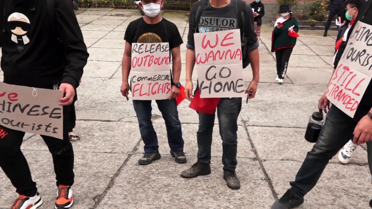 चिनियाँ पर्यटकहरुले आफुहरु आफ्नो घर फिर्ता हुन पाउनुपर्ने माग गर्दै काठमाडौंको भृकुटीमण्डप स्थित पर्यटन बोर्ड पुगेका हुन् । २५-३० जनाको संख्यामा रहेका चिनियाँ पर्यटकहरु ‘हामी घर जान चाहन्छौं’ लेखिएका ब्यानर बोकेर पर्यटन बोर्ड पुगेका हुन् । उनीहरुले चीन जानका लागि कुनैपनि उडान नभएको र आफुहरुलाई नेपाल छाडन कुनैपनि विकल्प नभएकोले अलपत्र परेको बताएका छन् ।