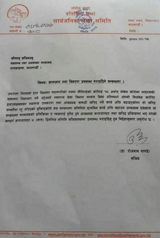 त्यस्तै उक्त समितिले स्वास्थ्य सेवा विभागमार्फत खरिद गरिएको स्वास्थ्य सामग्रीको सम्पूर्ण कागजपत्र सात दिनभित्र उपलब्ध गराउन सरकारलाई निर्देशनसमेत दिएको छ ।
