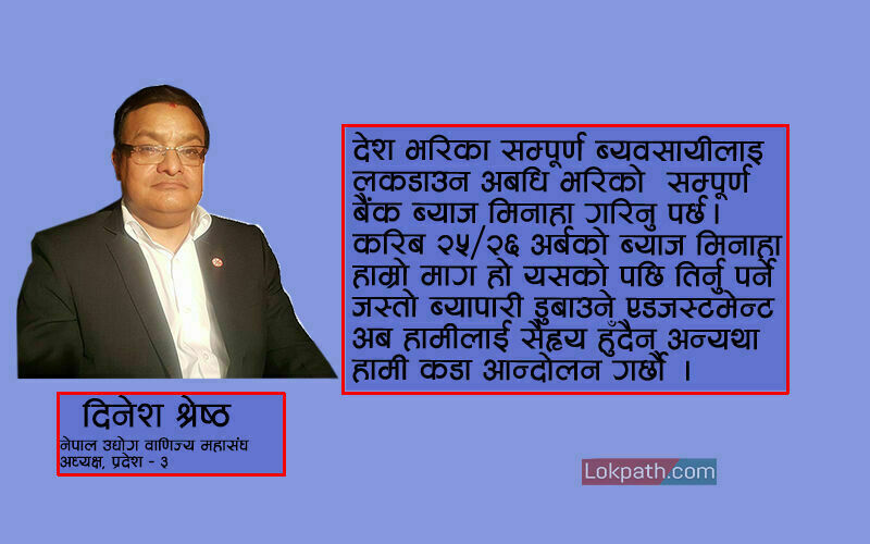प्रदेश तीनका अध्यक्ष दिनेश श्रेष्ठ नव नियुक्त गभर्नरले गठन गरेको कमिटीमा ब्यवसायीहरुको प्रतिनिधित्व नभएको र कर्मचारी र ब्याङ्करहरुले मात्र उद्योगी व्यवसायीको वास्तविक मार बुझ्न नसक्ने बताउँदैछन् । श्रेष्ठ भन्छन्, “हामीलाई कम ब्याज दरमा थप रकम उपलब्ध गराइदिनुपर्छ र अहिले यो बन्द अवधिको जुन ब्याज छ, यसलाई राहतको रुपमा त्यो ब्याज मिनाहा गरिदिने यो नै हो हाम्रो माग । प्रस्तुत छ, लोकपथ डटकमले नेपाल उद्योग वाणिज्य महासंघ प्रदेश ३ का अध्यक्ष दिनेश श्रेष्ठसँग गरेको अन्तर्वार्ता :