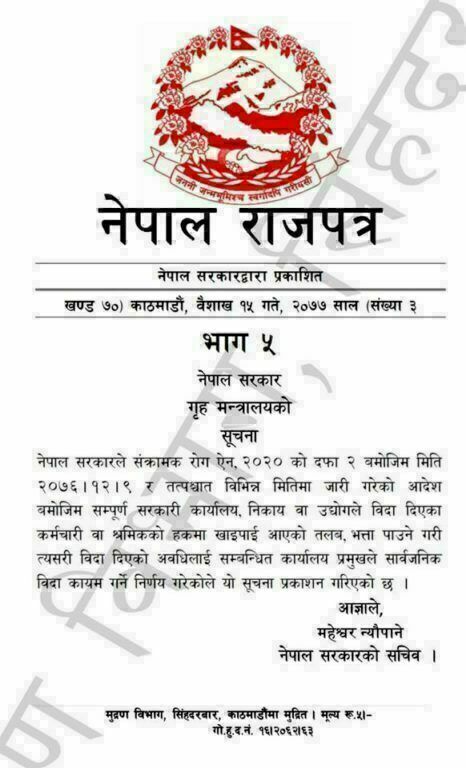 सोमवार गृह मन्त्रालयले नेपाल राजपत्रमा एक सूचना प्रकाशित गर्दै नेपाल सरकारले संक्रामक रोग ऐन २०२० को दफा २ अनुसार गत चैत ९ गते र त्यसपछिका मितिमा जारी भएका आदेश अनुरुप यो अवधिलाई सार्वजनिक विदासरह मानेर सो अवधिमा श्रमिकले खाइपाई आएको तलब भत्ता पाउने व्यवस्था गरेको हो ।