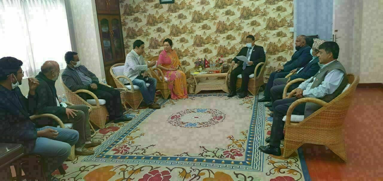 सो अवसरमा प्रतिनिधिमण्डलकातर्फबाट विभिन्न जिल्लाहरूमा निर्माण भैरहेका जलविद्युत आयोजनाहरूको निर्माणमा विभिन्न बाहनामा अवरोध हुंदै आएकाले निर्माण कार्यलाई निरन्तरता दिन स्थानीयस्तरमा समन्वय गरी सहयोग गर्न पनि आग्रह गरेका थिए ।