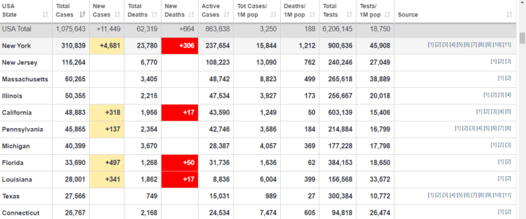 संयुक्त राज्य अमेरिकामा हालसम्म कोरोनाको कारण ज्यान गुमाउनको संख्या ६२ हजार ३ सय १९ जना पुगेको छ । भने बितेको २४ घण्टामा थप ११ हजार ४ सय ४९ जना मानिसमा कोरोना संक्रमण देखिएको तथा ६ सय ६४ जनाको आज मात्रै मृत्यु भएको वल्डोमिटरको तथ्यांकले देखाएको छ ।