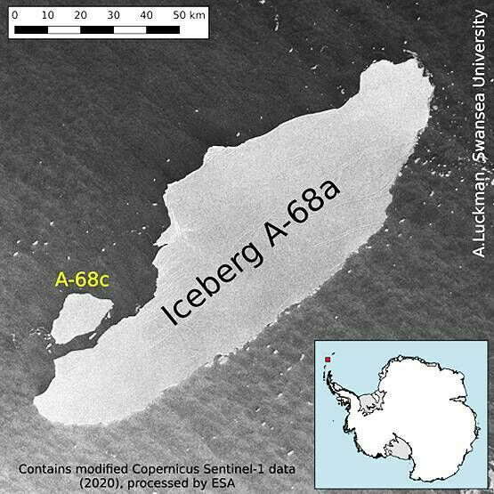२३ अप्रिलमा युरोपीयन स्पेस एजेन्सीको स्याटेलाइट ‘सेन्टीनल-१’ ले यसको नयाँ तस्वीर सार्वजनिक गरेको थियो । यो आइसवर्ग (ए-६८-ए) तीव्र गतिमा समुन्द्रमा बग्दै आईरहेको छ ।
