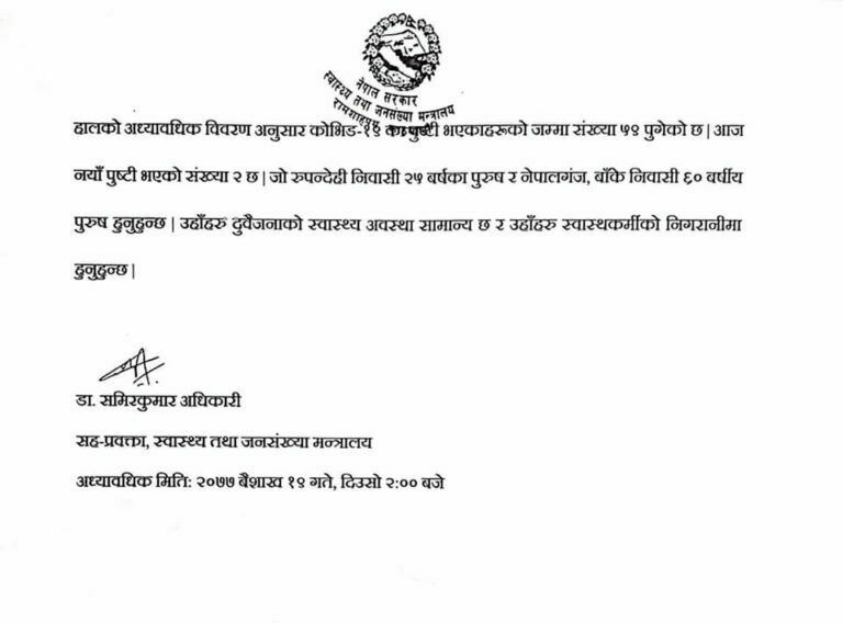 काठमाडौं । नेपालमा थप २ जनामा कोरोना संक्रमण पुष्टि भएको छ । कोरोना संक्रमण हुनेमा रुपन्देही निवासी २५ वर्षीय पुरुष तथा नेपालगञ्ज, बाँके निवासी ६० वर्षीय पुरुष रहेका छन् ।