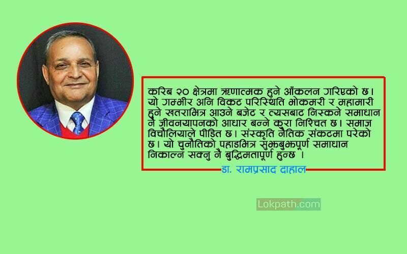 करिब २० क्षेत्रमा ऋणात्मक हुने आँकलन गरिएको छ । यो गम्भीर अनि विकट परिस्थिति भोकमरी र महामारी हुने खतराभित्र आउने बजेट र त्यसबाट निस्कने समाधान नै जीवनयापनको आधार बन्ने कुरा निश्चित छ । समाज विचौलियाले पीडित छ । संस्कृति नैतिक संकटमा परेको छ । यो चुनौतिको पहाडभित्र सुझबुझपूर्ण समाधान निकाल्न सक्नु नै बुद्धिमतापूर्ण हुन्छ ।
