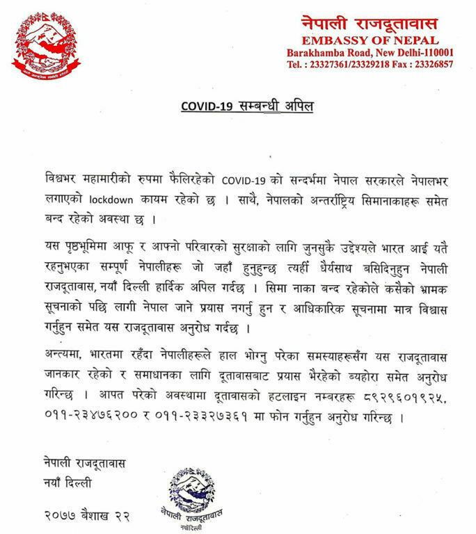 भारतमा रहेका नेपालीलाई घर नफर्किन आग्रह गर्दै दूतावासले निकाल्यो यस्तो विज्ञप्ती