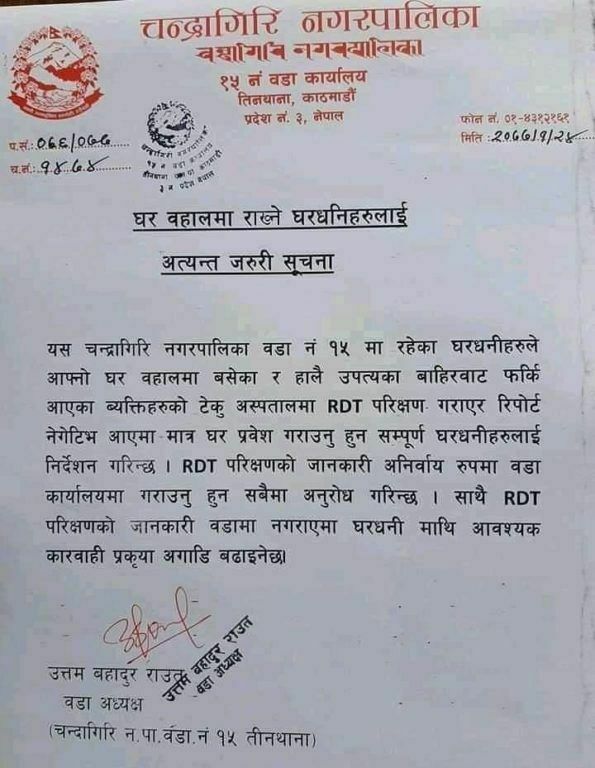 नगरपालिकाको वडा नम्बर १५ ले एक सूचना जारी गर्दै त्यस्तो नियम लागू गरेको हो । नगरपालिकाले आफ्नो क्षेत्रभित्रका घर बहालमा बसेका तथा देशका विभिन्न ठाँउबाट हालसालै उपत्यका छिरेका मानिसहरुको कोरोना परीक्षण गर्नुपर्ने बताएको हो ।