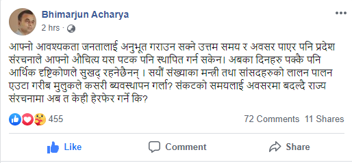 सामाजिक सञ्जाल फेसबुकमा लेखेका छन्, “सयौं संख्याका मन्त्री तथा सांसदहरुको लालन पालन एउटा गरीब मुलुकले कसरी ब्यवस्थापन गर्ला? संकटको समयलाई अवसरमा बदल्दै राज्य संरचनामा अब त केही हेरफेर गर्ने कि? ”