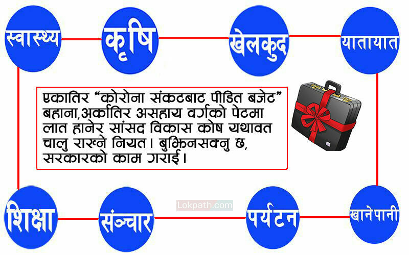 अनि यस्तो अनुत्पादक र भ्रष्टाचारको पोको किन सांसदहरूलाई दिने ? आगामी बजेटमा यसलाई बन्द गरिएमामात्र कोरोना संकटप्रति सरकार संवेदनशील र जनताप्रति उत्तरदायी भएको प्रमाणित हुनसक्छ । नत्र बजेटले समाजवादको दिशा देखाएर व्यक्तिवादको संस्कारलाई बढावा दिने चरित्रको पृष्ठपोषण गरेको प्रमाणित हुन्छ । असंवैधानिक हुने कामका लागि बजेटले खर्च व्यवस्था गर्नुहुँदैन ।